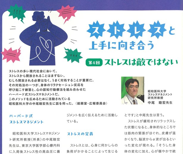 一般社団法人日本薬局協会が発行する月刊誌「KYOREI」10月号(No.879)に、ストレスマネジメントについてのインタビュー記事「ストレスと上手に向き合う」が掲載されました(第2-3頁)。6・7月号の小林如乃先生のインタビュー記事「ストレスマネジメント(前編・後編)」に続く特集記事です。当研究所が実践・啓発しているプログラム「MIND BODY TRAINER」(リラクセーション反応の練習+認知行動療法)の宣伝もさせてもらいました。