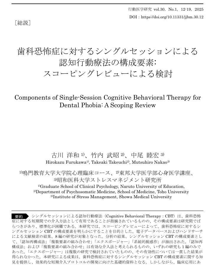 古川洋和先生(鳴門教育大学大学院心理臨床コース)が執筆した総説論文が「行動医学研究」に刊行されました(古川洋和, 竹内武昭, 中尾睦宏. 歯科恐怖症に対するシングルセッションによる認知行動療法の構成要素:スコーピングレビューによる検討. 行動医学研究 30(1):12-19, 2025)。全文はJ-stageで閲覧できます(https://www.jstage.jst.go.jp/…/30/1/30_12/_pdf/-char/ja)。古川先生は、日本行動医学会の教育研修委員長をなさっていて、定期的に行動医学に関するウェビナーを開催しています。また、来年の2026年度に同学会の学術大会の大会長を担当されることが決まっています。中尾所長が2018年度に大会長を担当した際も徳島県での開催でしたので、また徳島に行けるのが楽しみです。