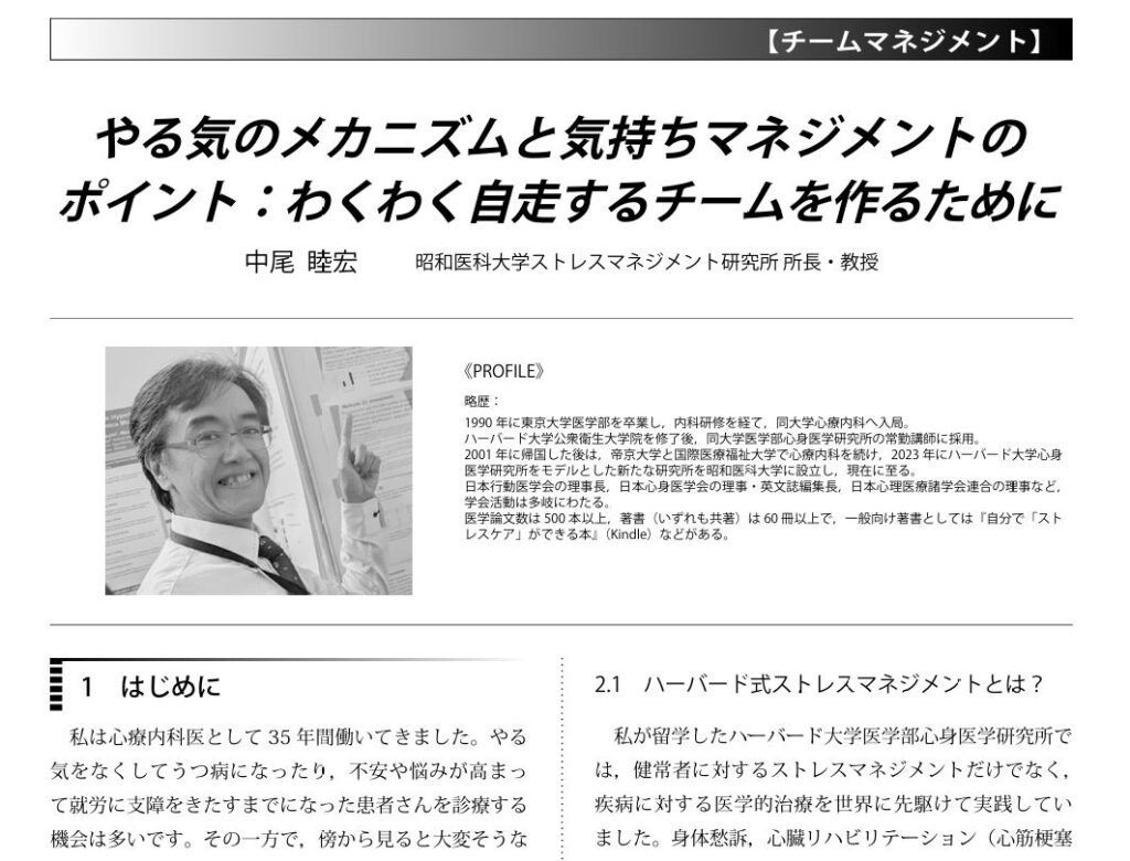 技術情報協会が出版している月刊誌「研究開発リーダー」に、中尾所長の原稿が掲載されています(中尾睦宏. やる気のメカニズムと気持ちマネジメントのポイント:わくわく自走するチームを作るために. 研究開発リーダー 22(10):75-77, 2026)。気持ちのマネジメントとストレスマネジメントのポイントや、わくわく自走するための動機づけとリーダーシップ等について解説をしています。